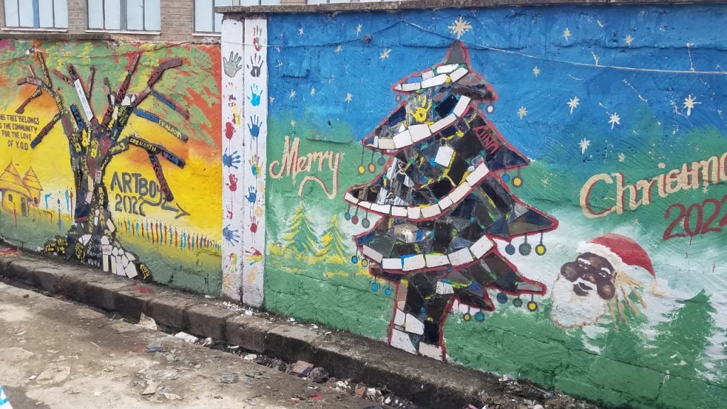As Shakur says:“ … we created safe space for teens and children as well as painted mosaic wall of Xmas tree 🎄 In the streets of Mukuru slums.