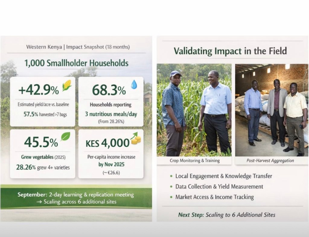 Income: monitoring (Nov 2025) shows ~KES 4,000 per-capita increase (~€26.6) supported by group marketing and reinvestment.
